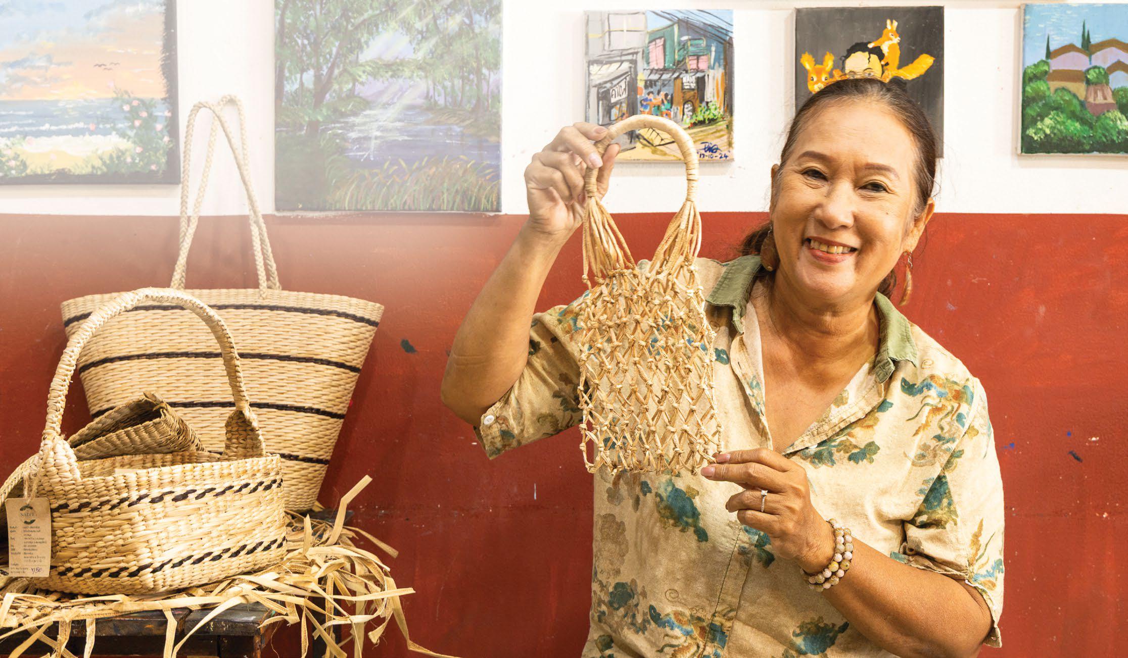 But Nadee is nothing if not persistent. She relocated to Samui in 2021, rented a home and a shopfront, and began lobbying for support. With help from Ang Thong labour of- ficials, she finally convinced Surat Thani authorities to fund community training. Soon, villagers who had once dis- missed the “mad” idea were learning to weave banana rope into everyday essentials.